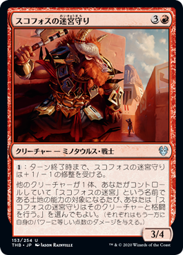 | Rules | : Skophos Maze-Warden gets +1/-1 until end of turn. Whenever another creature becomes the target of an ability of a land you control named Labyrinth of Skophos, you may have Skophos Maze-Warden fight that creature. (Each deals damage equal to its power to the other.) |