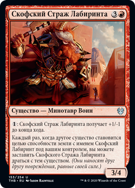| Rules | : Skophos Maze-Warden gets +1/-1 until end of turn. Whenever another creature becomes the target of an ability of a land you control named Labyrinth of Skophos, you may have Skophos Maze-Warden fight that creature. (Each deals damage equal to its power to the other.) |