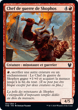 | Rules | , Sacrifice another creature or an enchantment: Skophos Warleader gets +1/+0 and gains menace until end of turn. (It can't be blocked except by two or more creatures.) |