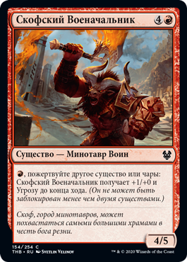 | Rules | , Sacrifice another creature or an enchantment: Skophos Warleader gets +1/+0 and gains menace until end of turn. (It can't be blocked except by two or more creatures.) |