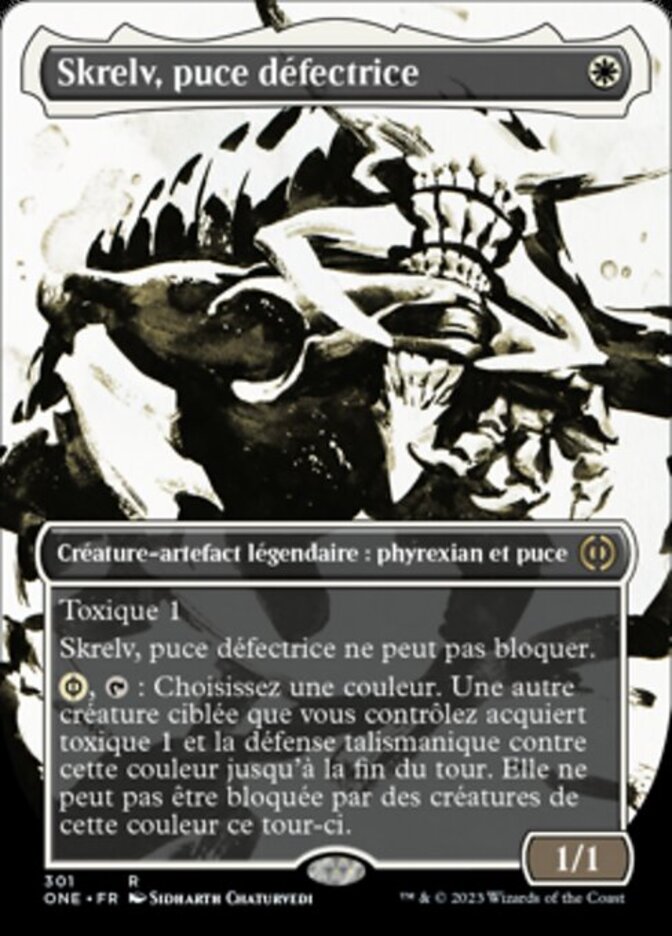 | Rules | Toxic 1 (Players dealt combat damage by this creature also get a poison counter.) Skrelv, Defector Mite can't block. , : Choose a color. Another target creature you control gains toxic 1 and hexproof from that color until end of turn. It can't be blocked by creatures of that color this turn. ( can be paid with either or life.) |