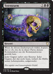 | Rules | When you cast this spell, copy it for each time you've cast your commander from the command zone this game. Each opponent sacrifices a creature. Each opponent who can't loses half their life, rounded up. |