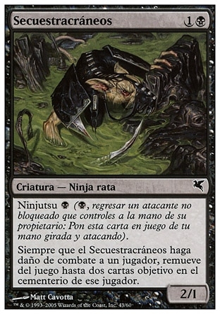 | Rules | Ninjutsu (, Return an unblocked attacker you control to hand: Put this card onto the battlefield from your hand tapped and attacking.) Whenever Skullsnatcher deals combat damage to a player, exile up to two target cards from that player's graveyard. |