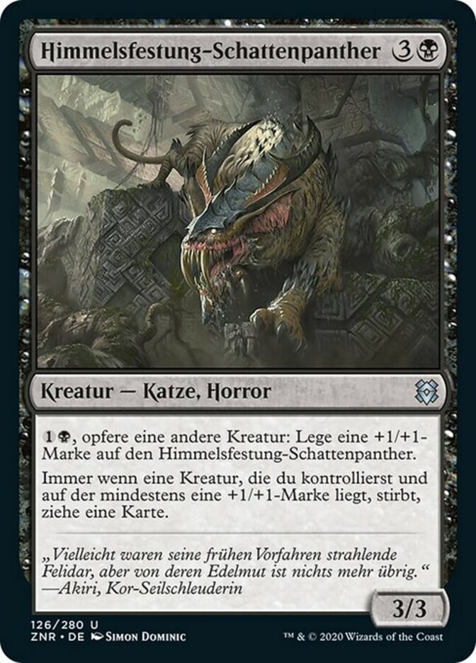 | Rules | , Sacrifice another creature: Put a +1/+1 counter on Skyclave Shadowcat. Whenever a creature you control with a +1/+1 counter on it dies, draw a card. |
