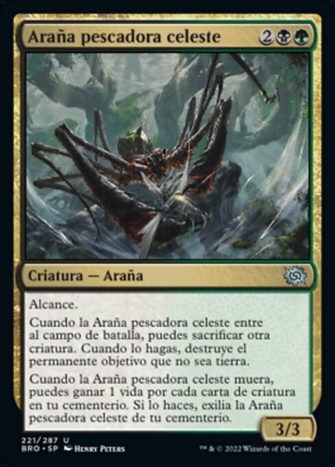 | Rules | Reach When Skyfisher Spider enters the battlefield, you may sacrifice another creature. When you do, destroy target nonland permanent. When Skyfisher Spider dies, you may gain 1 life for each creature card in your graveyard. If you do, exile Skyfisher Spider from your graveyard. |