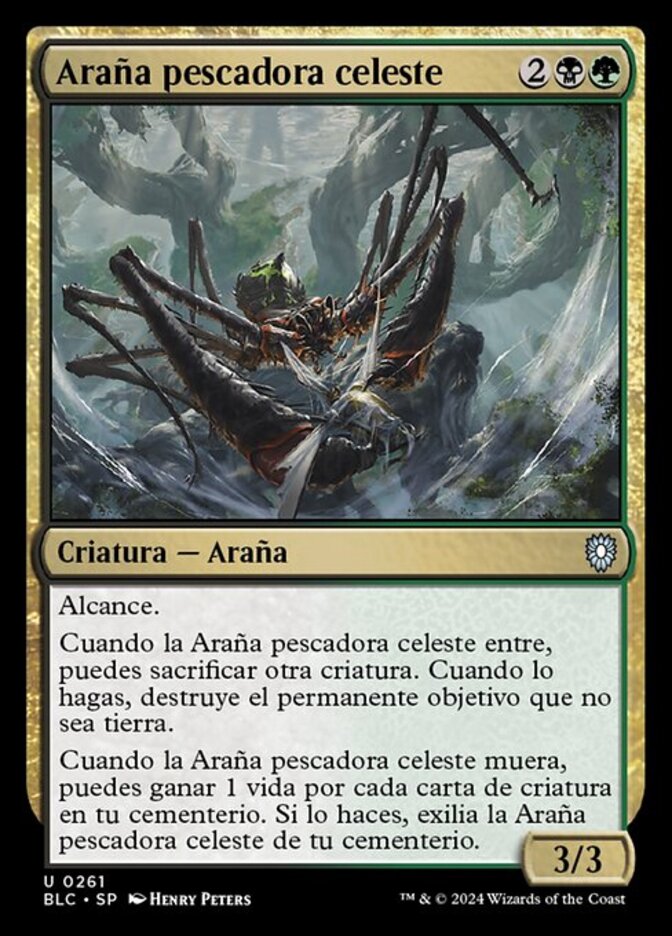 | Rules | Reach When Skyfisher Spider enters the battlefield, you may sacrifice another creature. When you do, destroy target nonland permanent. When Skyfisher Spider dies, you may gain 1 life for each creature card in your graveyard. If you do, exile Skyfisher Spider from your graveyard. |