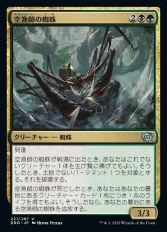 | Rules | Reach When Skyfisher Spider enters the battlefield, you may sacrifice another creature. When you do, destroy target nonland permanent. When Skyfisher Spider dies, you may gain 1 life for each creature card in your graveyard. If you do, exile Skyfisher Spider from your graveyard. |