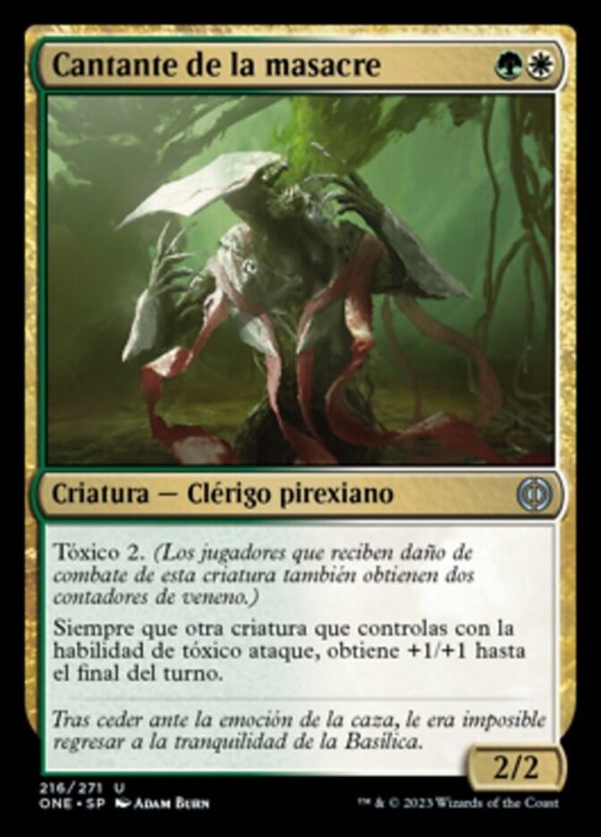| Rules | Toxic 2 (Players dealt combat damage by this creature also get two poison counters.) Whenever another creature you control with toxic attacks, it gets +1/+1 until end of turn. |