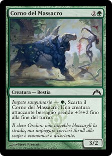 | Rules | Bloodrush — , Discard Slaughterhorn: Target attacking creature gets +3/+2 until end of turn. |
