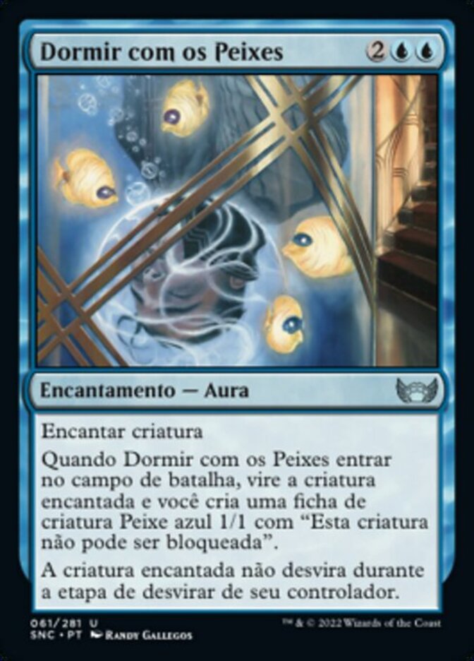 | Rules | Enchant creature When Sleep with the Fishes enters the battlefield, tap enchanted creature and you create a 1/1 blue Fish creature token with "This creature can't be blocked." Enchanted creature doesn't untap during its controller's untap step. |