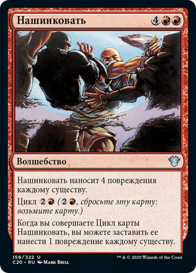 | Rules | Slice and Dice deals 4 damage to each creature. Cycling (, Discard this card: Draw a card.) When you cycle Slice and Dice, you may have it deal 1 damage to each creature. |