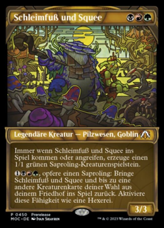 | Rules | Whenever Slimefoot and Squee enters the battlefield or attacks, create a 1/1 green Saproling creature token. , Sacrifice a Saproling: Return Slimefoot and Squee and up to one other target creature card from your graveyard to the battlefield. Activate only as a sorcery. |