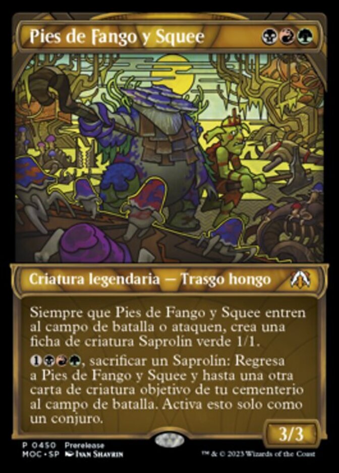 | Rules | Whenever Slimefoot and Squee enters the battlefield or attacks, create a 1/1 green Saproling creature token. , Sacrifice a Saproling: Return Slimefoot and Squee and up to one other target creature card from your graveyard to the battlefield. Activate only as a sorcery. |