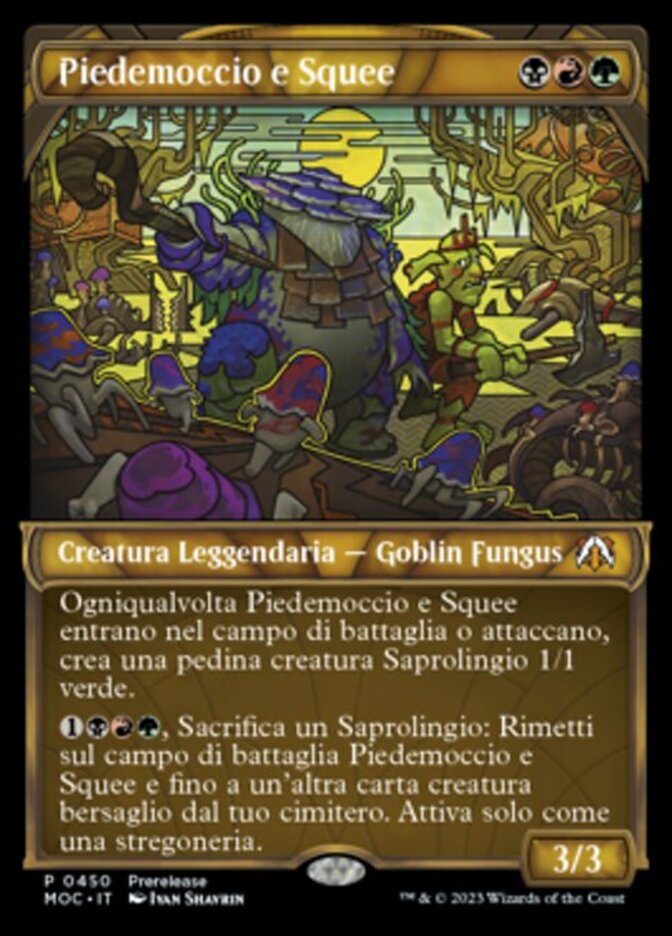 | Rules | Whenever Slimefoot and Squee enters the battlefield or attacks, create a 1/1 green Saproling creature token. , Sacrifice a Saproling: Return Slimefoot and Squee and up to one other target creature card from your graveyard to the battlefield. Activate only as a sorcery. |