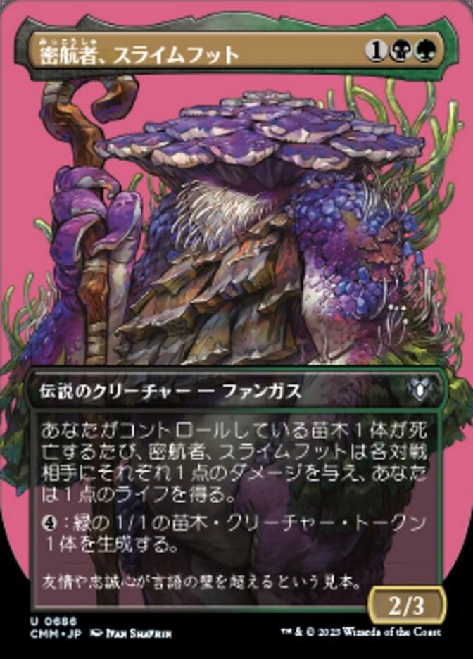 | Rules | Whenever a Saproling you control dies, Slimefoot, the Stowaway deals 1 damage to each opponent and you gain 1 life. : Create a 1/1 green Saproling creature token. |