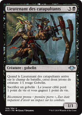 | Rules | When Sling-Gang Lieutenant enters the battlefield, create two 1/1 red Goblin creature tokens. Sacrifice a Goblin: Target player loses 1 life and you gain 1 life. |
