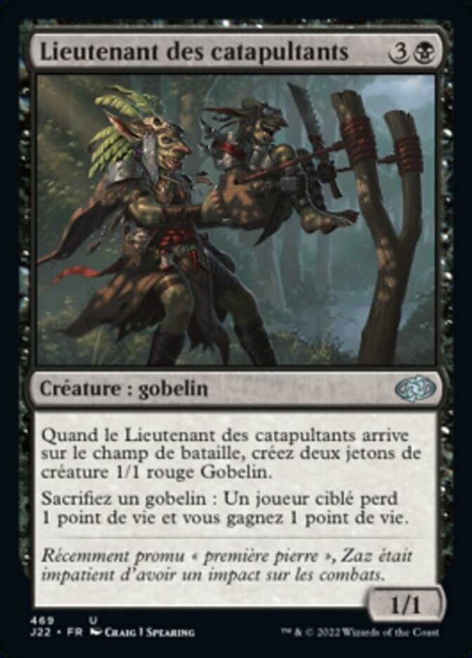 | Rules | When Sling-Gang Lieutenant enters the battlefield, create two 1/1 red Goblin creature tokens. Sacrifice a Goblin: Target player loses 1 life and you gain 1 life. |