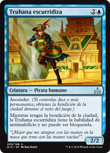 | Rules | Ascend (If you control ten or more permanents, you get the city's blessing for the rest of the game.) As long as you have the city's blessing, Slippery Scoundrel has hexproof and can't be blocked. |