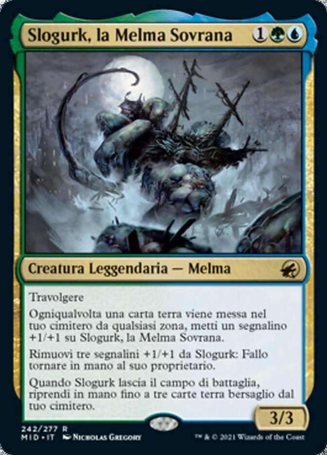 | Rules | Trample Whenever a land card is put into your graveyard from anywhere, put a +1/+1 counter on Slogurk, the Overslime. Remove three +1/+1 counters from Slogurk: Return it to its owner's hand. When Slogurk leaves the battlefield, return up to three target land cards from your graveyard to your hand. |