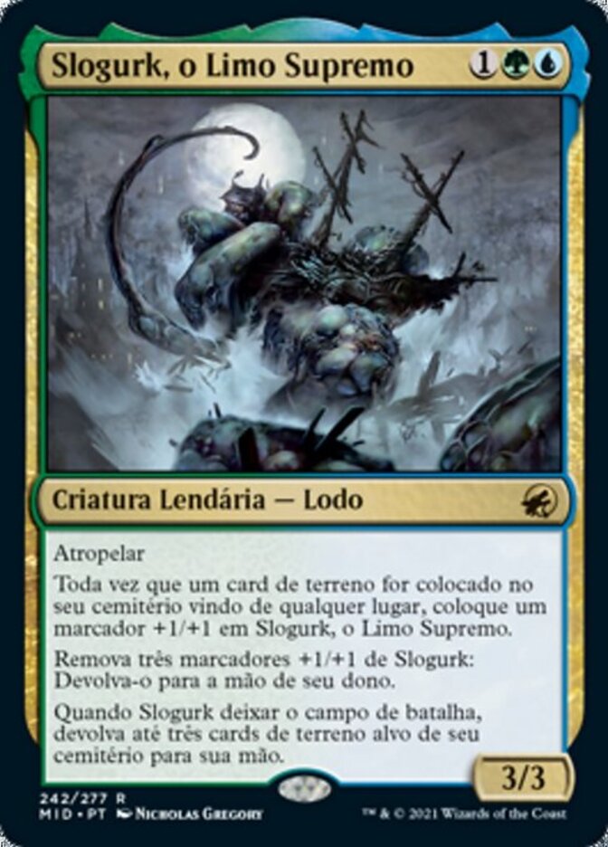 | Rules | Trample Whenever a land card is put into your graveyard from anywhere, put a +1/+1 counter on Slogurk, the Overslime. Remove three +1/+1 counters from Slogurk: Return it to its owner's hand. When Slogurk leaves the battlefield, return up to three target land cards from your graveyard to your hand. |