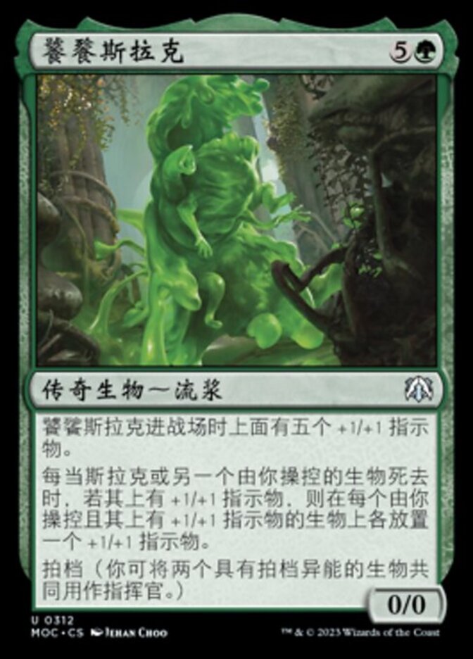 | Rules | Slurrk, All-Ingesting enters the battlefield with five +1/+1 counters on it. Whenever Slurrk or another creature you control dies, if it had a +1/+1 counter on it, put a +1/+1 counter on each creature you control that has a +1/+1 counter on it. Partner (You can have two commanders if both have partner.) |
