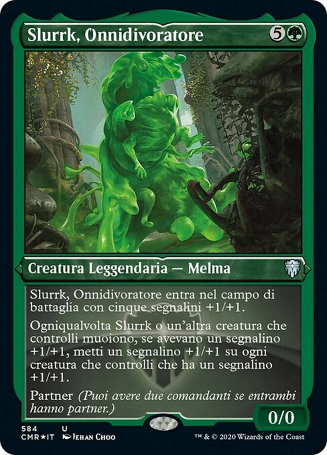 | Rules | Slurrk, All-Ingesting enters the battlefield with five +1/+1 counters on it. Whenever Slurrk or another creature you control dies, if it had a +1/+1 counter on it, put a +1/+1 counter on each creature you control that has a +1/+1 counter on it. Partner (You can have two commanders if both have partner.) |