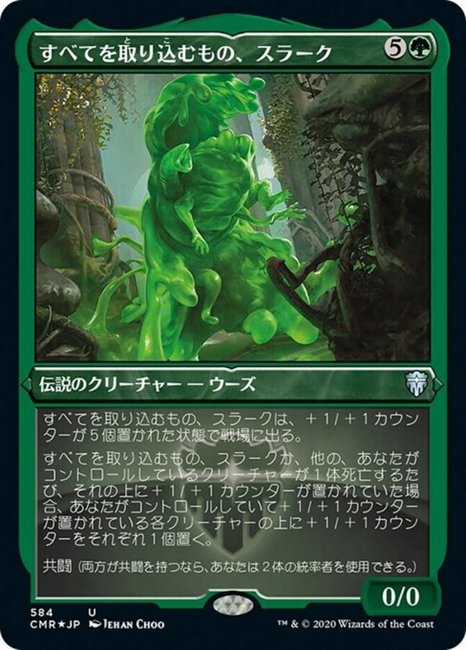 | Rules | Slurrk, All-Ingesting enters the battlefield with five +1/+1 counters on it. Whenever Slurrk or another creature you control dies, if it had a +1/+1 counter on it, put a +1/+1 counter on each creature you control that has a +1/+1 counter on it. Partner (You can have two commanders if both have partner.) |