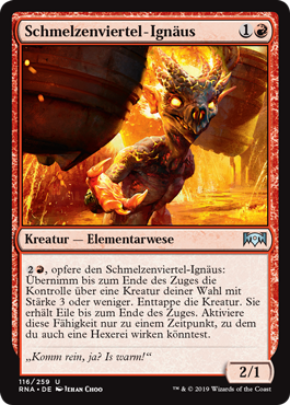 | Rules | , Sacrifice Smelt-Ward Ignus: Gain control of target creature with power 3 or less until end of turn. Untap that creature. It gains haste until end of turn. Activate only as a sorcery. |