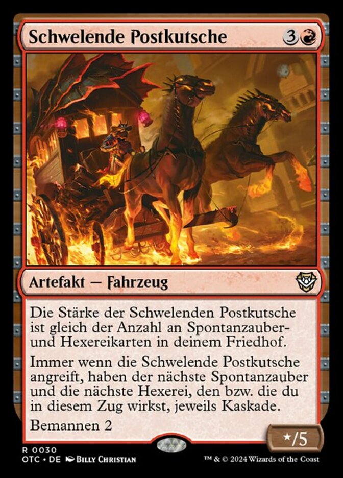 | Rules | Smoldering Stagecoach's power is equal to the number of instant and sorcery cards in your graveyard. Whenever Smoldering Stagecoach attacks, the next instant spell and the next sorcery spell you cast this turn each have cascade. Crew 2 |