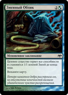| Rules | Until end of turn, target creature loses all abilities and becomes a green Snake with base power and toughness 1/1. Draw a card. |