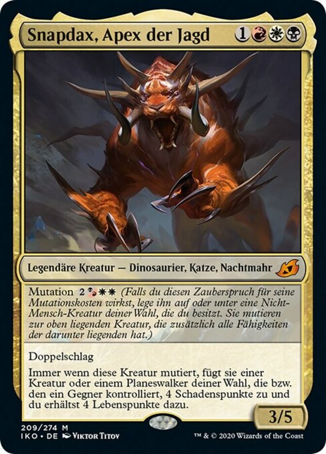 | Rules | Mutate (If you cast this spell for its mutate cost, put it over or under target non-Human creature you own. They mutate into the creature on top plus all abilities from under it.) Double strike Whenever this creature mutates, it deals 4 damage to target creature or planeswalker an opponent controls and you gain 4 life. |