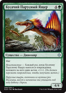 | Flavor | Lurking beneath the murky waters of Ixalan's rivers, sailbacks can rip a meal off the shore in the blink of an eye. |