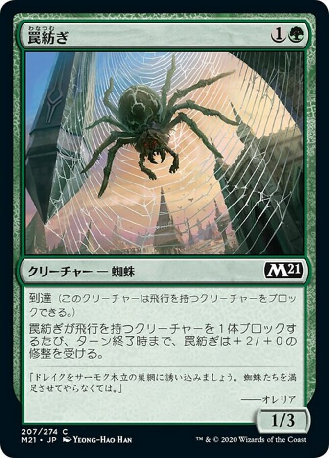 | Rules | Reach (This creature can block creatures with flying.) Whenever Snarespinner blocks a creature with flying, Snarespinner gets +2/+0 until end of turn. |