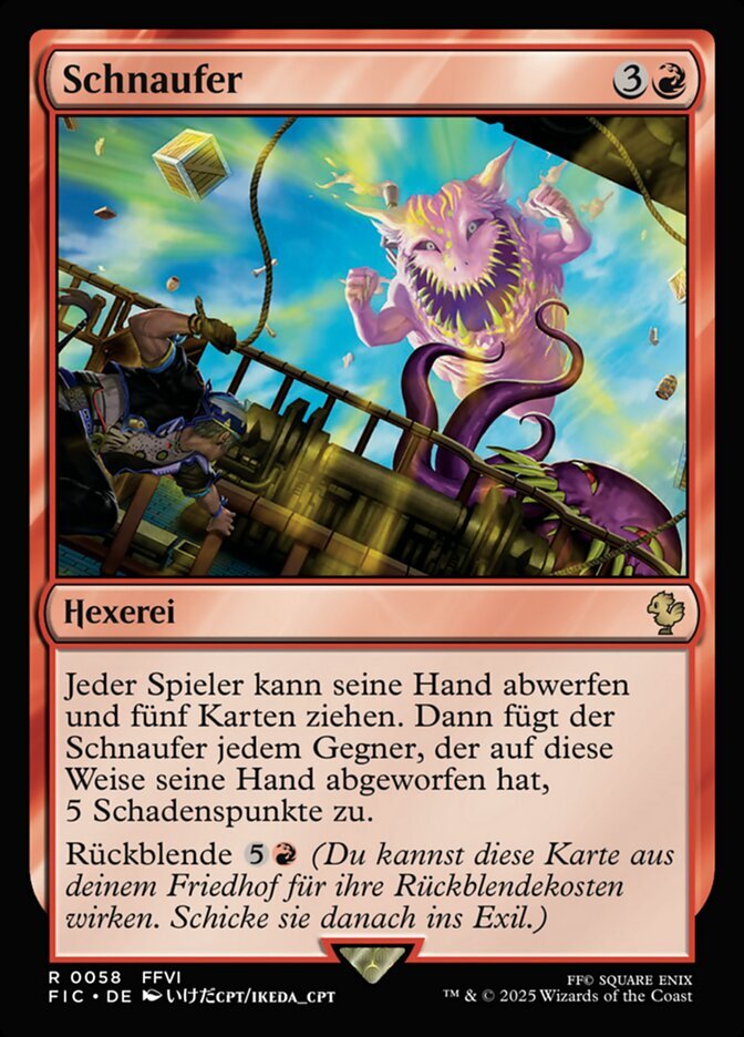 | Rules | Each player may discard their hand and draw five cards. Then Snort deals 5 damage to each opponent who discarded their hand this way. Flashback (You may cast this card from your graveyard for its flashback cost. Then exile it.) |