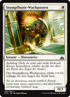 | Rules | Ascend (If you control ten or more permanents, you get the city's blessing for the rest of the game.) Snubhorn Sentry gets +3/+0 as long as you have the city's blessing. |