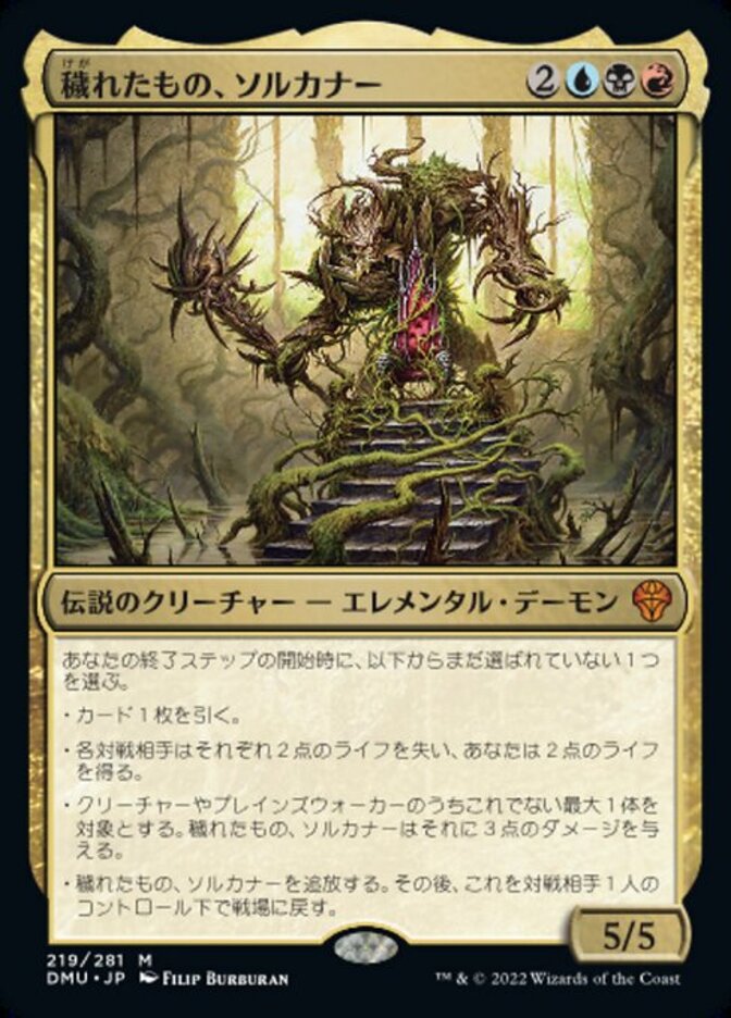 | Rules | At the beginning of your end step, choose one that hasn't been chosen — • Draw a card. • Each opponent loses 2 life and you gain 2 life. • Sol'Kanar the Tainted deals 3 damage to up to one other target creature or planeswalker. • Exile Sol'Kanar, then return it to the battlefield under an opponent's control. |