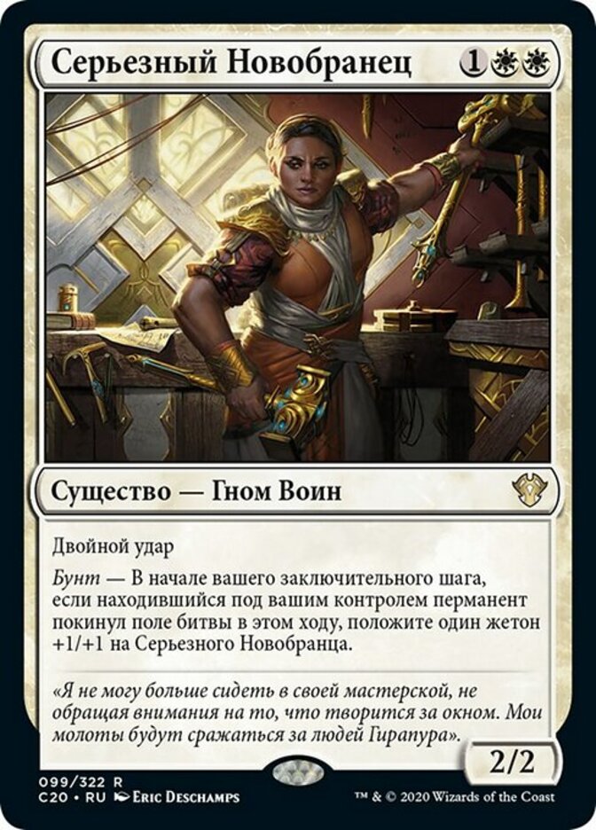 | Rules | Double strike Revolt — At the beginning of your end step, if a permanent you controlled left the battlefield this turn, put a +1/+1 counter on Solemn Recruit. |