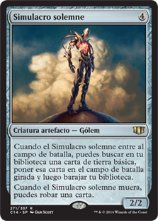 | Rules | When Solemn Simulacrum enters the battlefield, you may search your library for a basic land card, put that card onto the battlefield tapped, then shuffle. When Solemn Simulacrum dies, you may draw a card. |