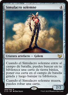 | Rules | When Solemn Simulacrum enters the battlefield, you may search your library for a basic land card, put that card onto the battlefield tapped, then shuffle. When Solemn Simulacrum dies, you may draw a card. |