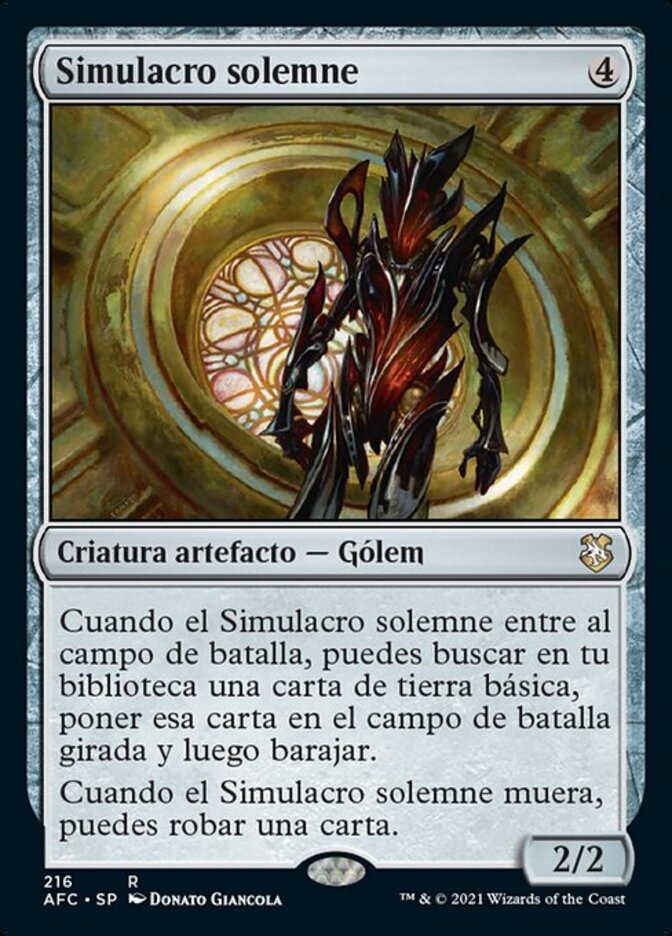 | Rules | When Solemn Simulacrum enters the battlefield, you may search your library for a basic land card, put that card onto the battlefield tapped, then shuffle. When Solemn Simulacrum dies, you may draw a card. |