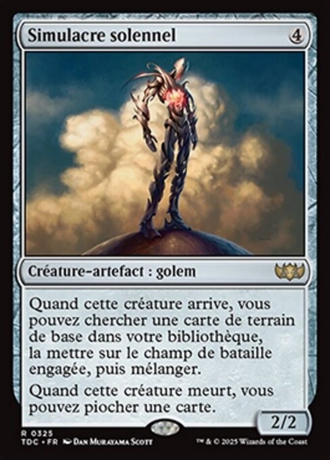 | Rules | When Solemn Simulacrum enters the battlefield, you may search your library for a basic land card, put that card onto the battlefield tapped, then shuffle. When Solemn Simulacrum dies, you may draw a card. |