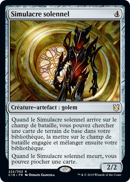 | Rules | When Solemn Simulacrum enters the battlefield, you may search your library for a basic land card, put that card onto the battlefield tapped, then shuffle. When Solemn Simulacrum dies, you may draw a card. |