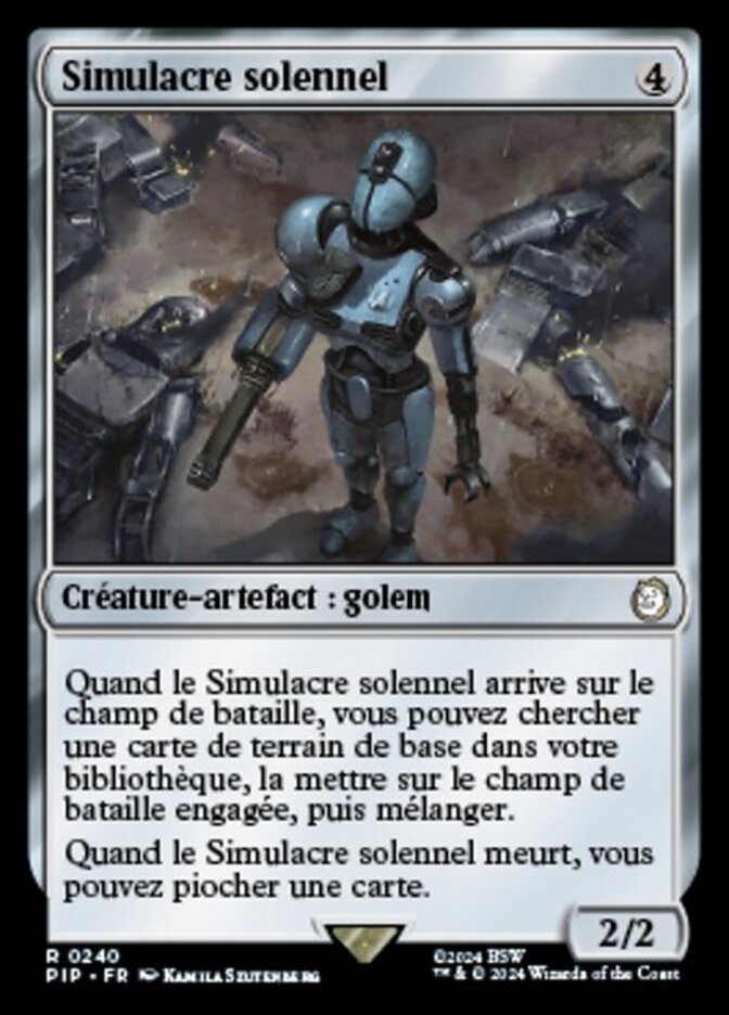 | Rules | When Solemn Simulacrum enters the battlefield, you may search your library for a basic land card, put that card onto the battlefield tapped, then shuffle. When Solemn Simulacrum dies, you may draw a card. |