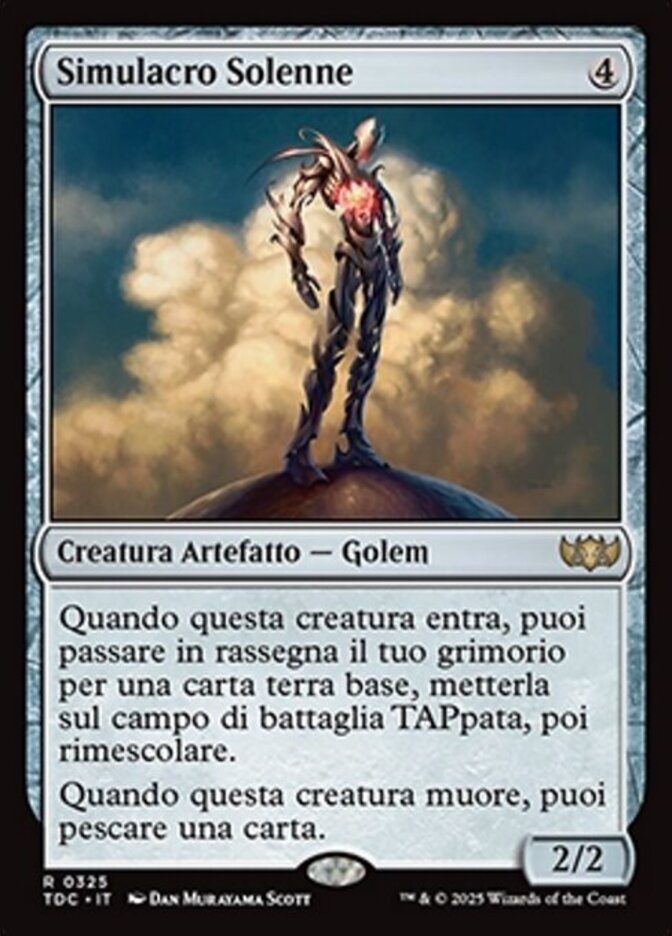 | Rules | When Solemn Simulacrum enters the battlefield, you may search your library for a basic land card, put that card onto the battlefield tapped, then shuffle. When Solemn Simulacrum dies, you may draw a card. |