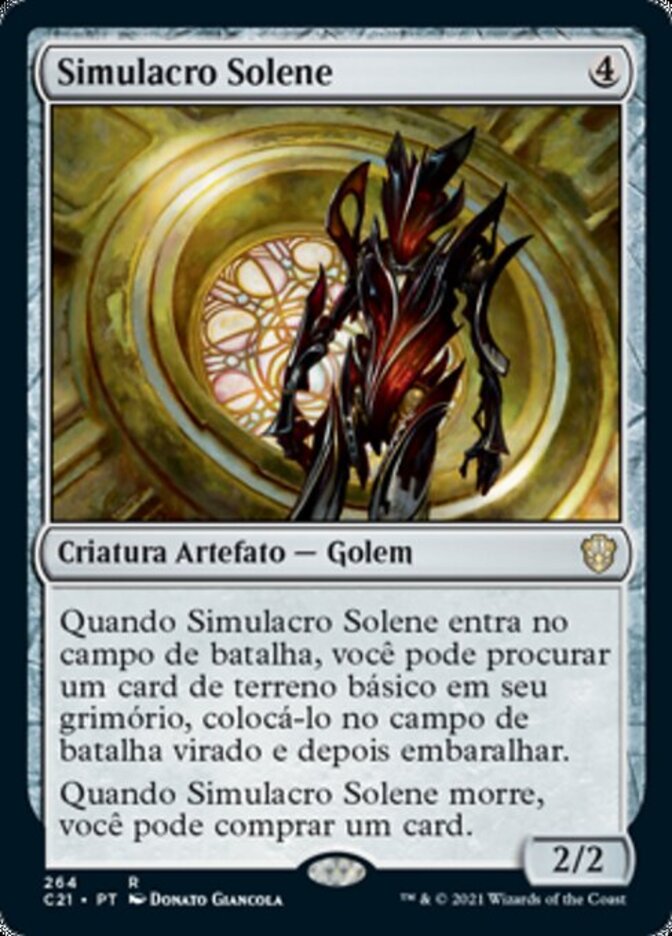 | Rules | When Solemn Simulacrum enters the battlefield, you may search your library for a basic land card, put that card onto the battlefield tapped, then shuffle. When Solemn Simulacrum dies, you may draw a card. |