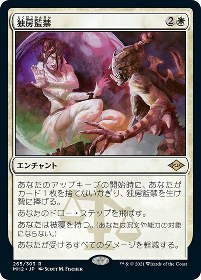 | Rules | At the beginning of your upkeep, sacrifice Solitary Confinement unless you discard a card. Skip your draw step. You have shroud. (You can't be the target of spells or abilities.) Prevent all damage that would be dealt to you. |