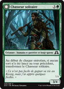 | Rules | At the beginning of each upkeep, if no spells were cast last turn, transform Solitary Hunter. // At the beginning of each upkeep, if a player cast two or more spells last turn, transform One of the Pack. |