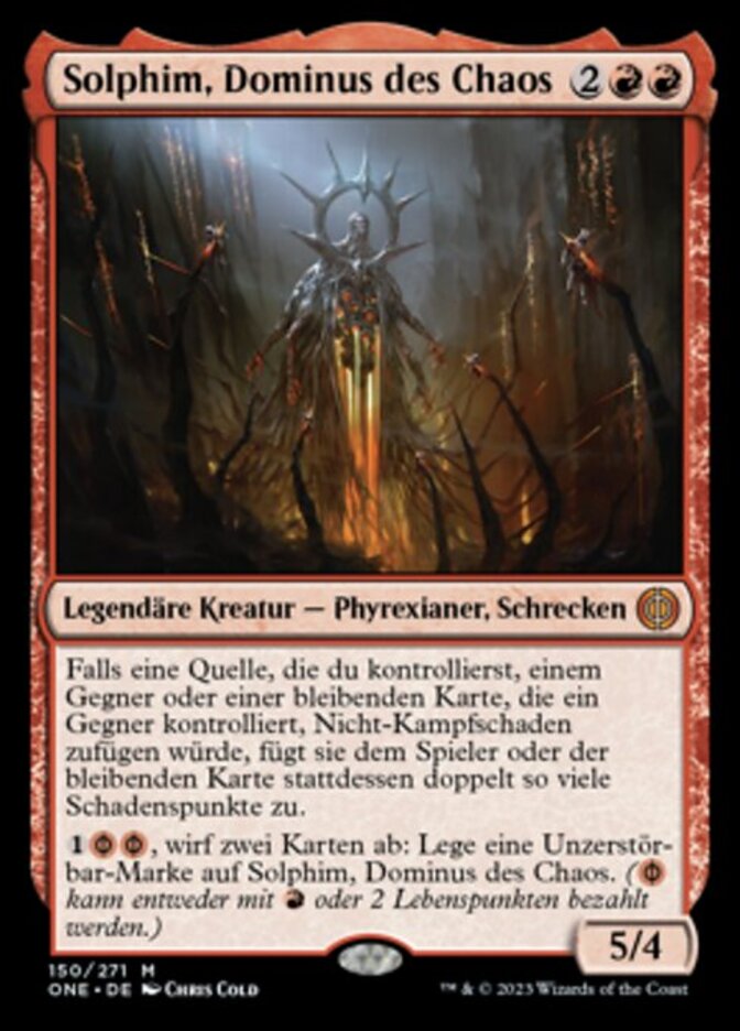 | Rules | If a source you control would deal noncombat damage to an opponent or a permanent an opponent controls, it deals double that damage to that player or permanent instead. , Discard two cards: Put an indestructible counter on Solphim, Mayhem Dominus. ( can be paid with either or 2 life.) |
