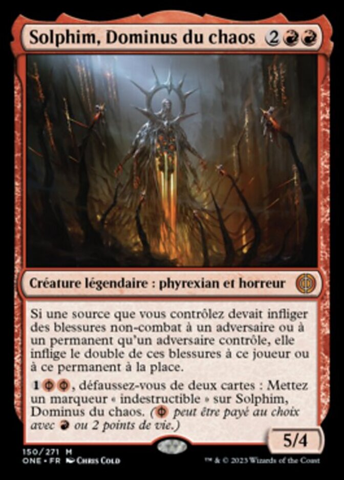 | Rules | If a source you control would deal noncombat damage to an opponent or a permanent an opponent controls, it deals double that damage to that player or permanent instead. , Discard two cards: Put an indestructible counter on Solphim, Mayhem Dominus. ( can be paid with either or 2 life.) |