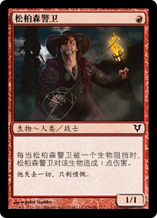 | Rules | Whenever Somberwald Vigilante becomes blocked by a creature, Somberwald Vigilante deals 1 damage to that creature. |